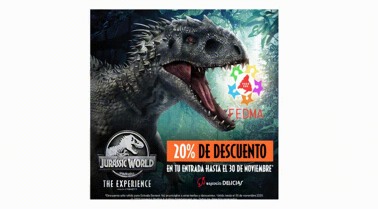 ¡Disfruta de un 20% de dto. en tu entrada general para Jurassic Wolrd: The Experience hasta el 30/11! *Descuento no acumulable a otras promociones o descuentos. Solo aplicable en entrada general.