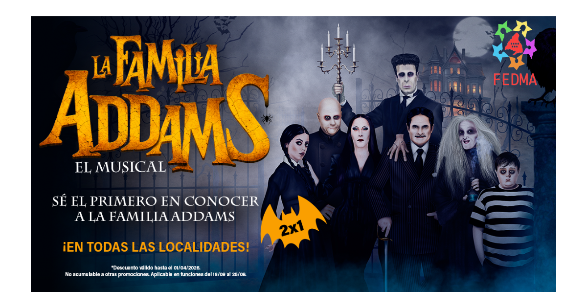 ¡Sé el primero en conocer a La Familia Addams! Disfruta un 2×1 por ser socio de FEDMA en todas las localidades hasta el 1/4/2026. *No acumulable a otros descuentos.