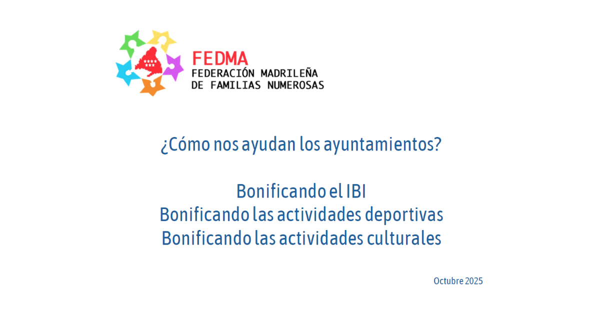 La Federación Madrileña de Familias Numerosas (FEDMA) ha presentado un año más su informe actualizado sobre las bonificaciones que los ayuntamientos de la Comunidad de Madrid ofrecen a las familias numerosas. Este estudio, realizado en septiembre de 2025, analiza las ordenanzas fiscales y normativas de los 81 municipios madrileños con más de 5.000 habitantes, centrándose en tres áreas clave: IBI, actividades deportivas y actividades culturales.