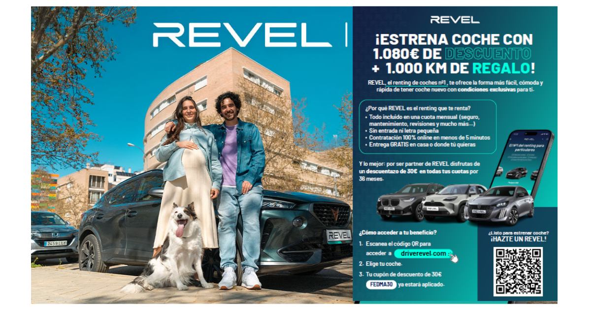 ¡REVEL es el mejor renting para particulares y más para familias numerosas! La forma más fácil de estrenar coche nuevo sin entrada y con todo incluido en una cuota mensual. ¡Y aún mejor! Si eres asociado de FEDMA, REVEL te regala un descuento exclusivo de 30€ en todas tus cuotas.